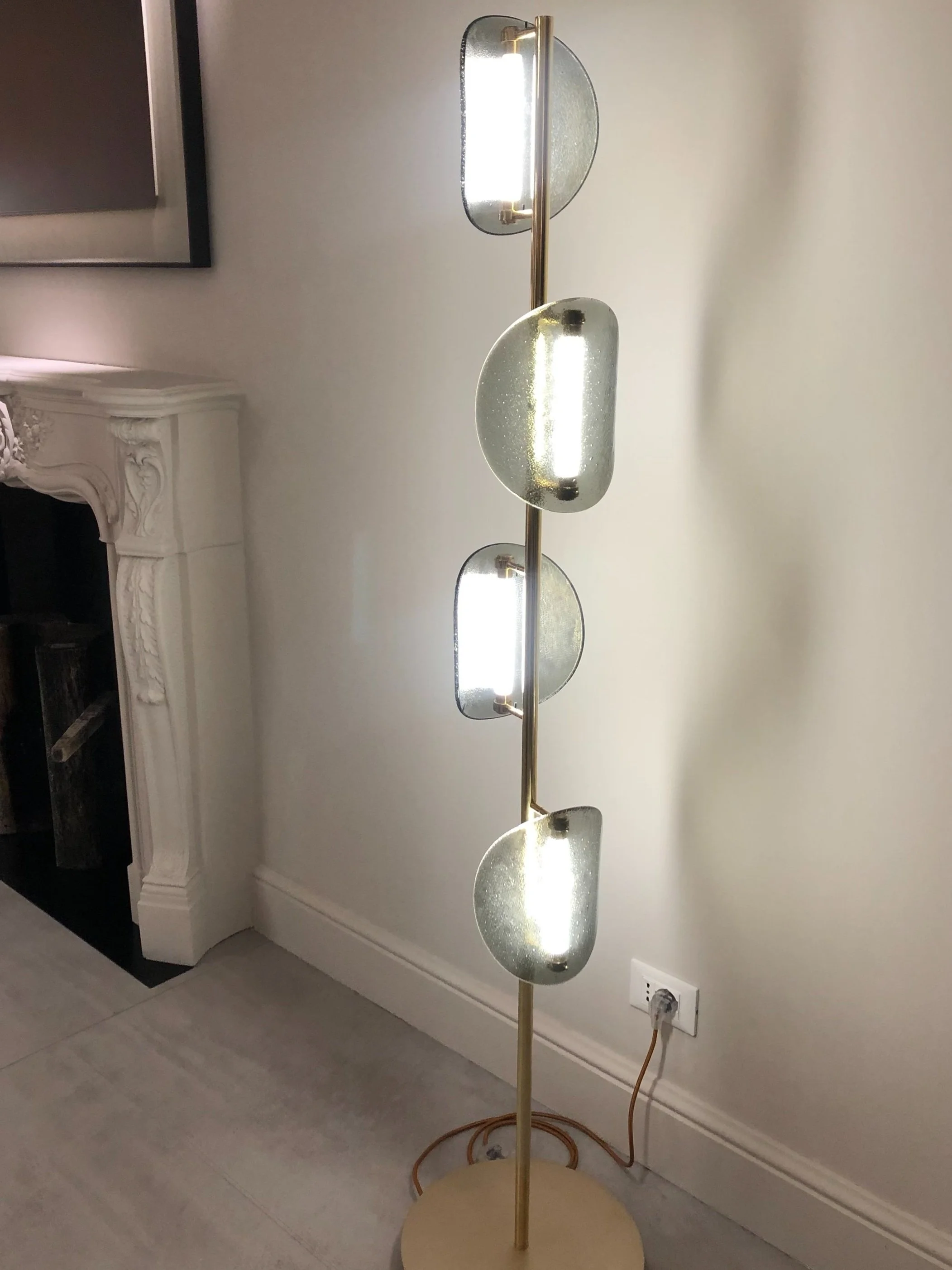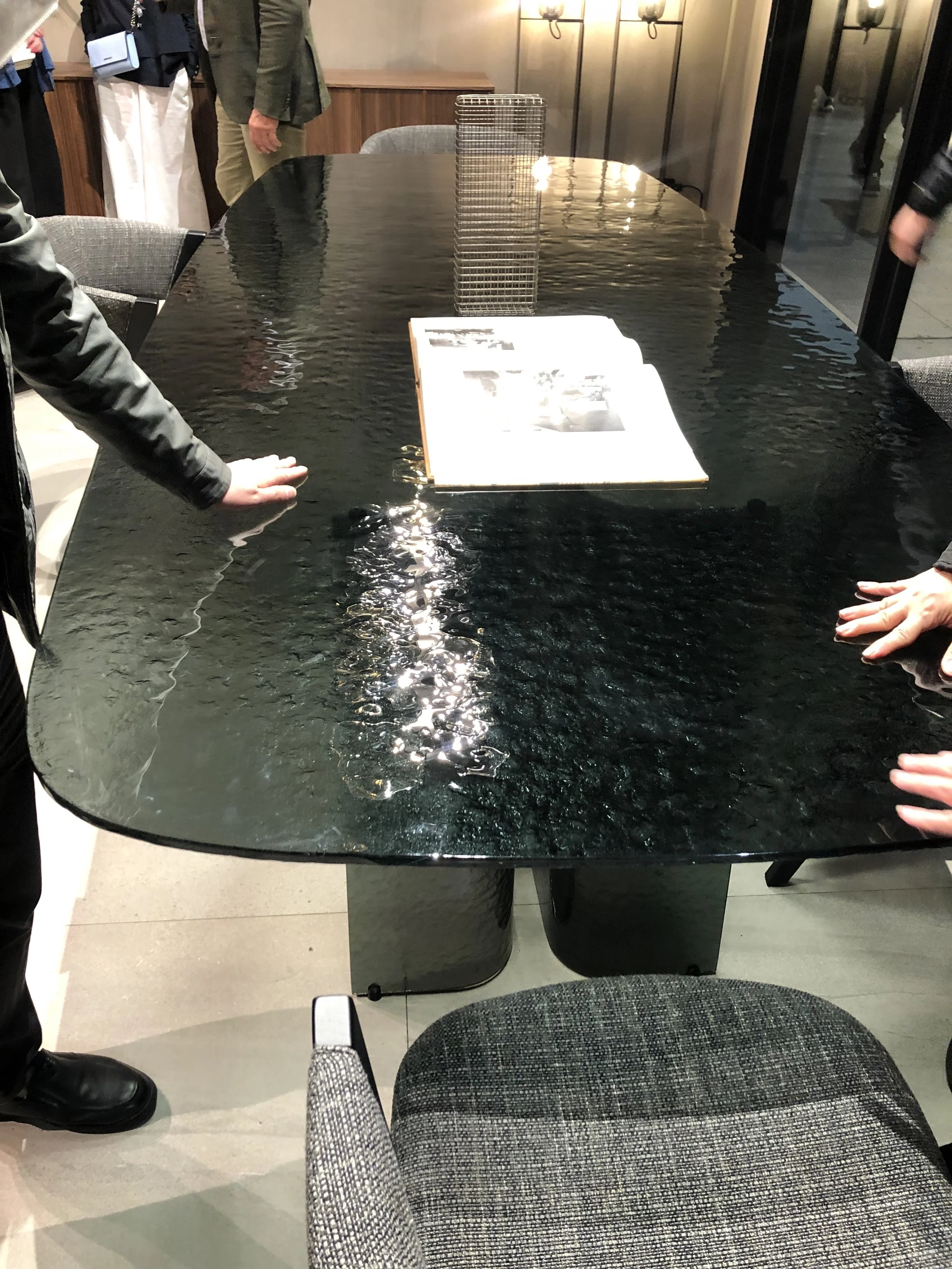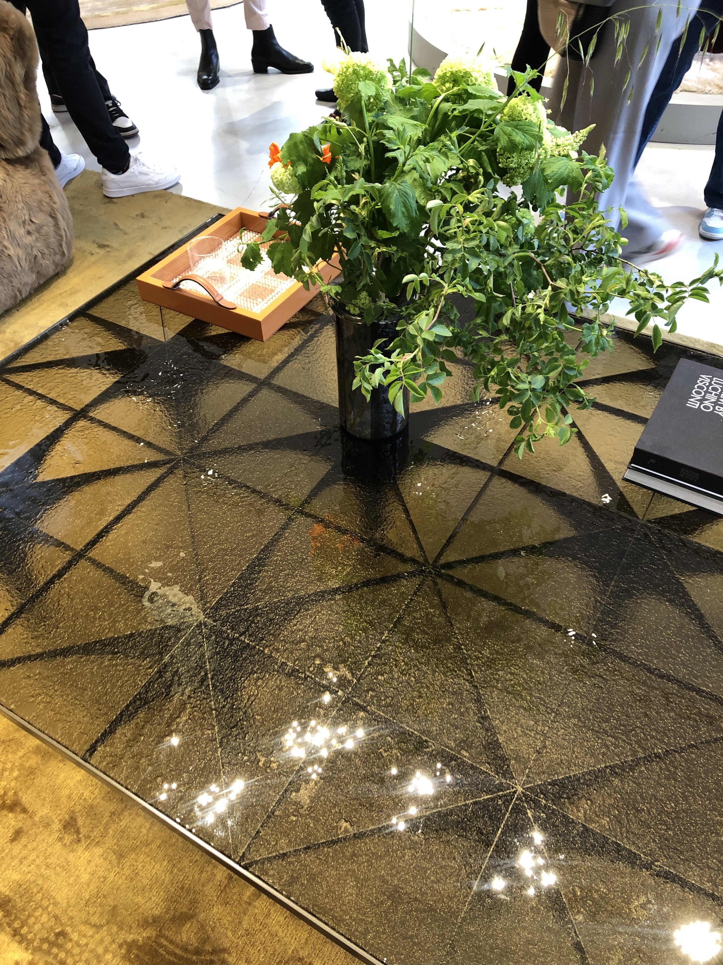 I saw beautiful, textured, and organic feeling of glasses everywhere, from coffee tables to side tables, dining tables, and lighting. They were beautifully imperfect, and the color variation was so diverse.